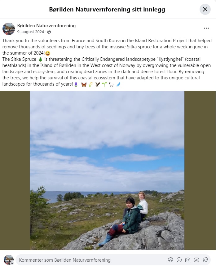 I 2024 arrangerte BNF “Island Restoration Project” hvor frivillige utenlandske studenter jobbet med sitkabekjempelse i en uke sommeren 2024. Det ble luket tusenvis av frøskudd og mindre trær i kystlyngheia.